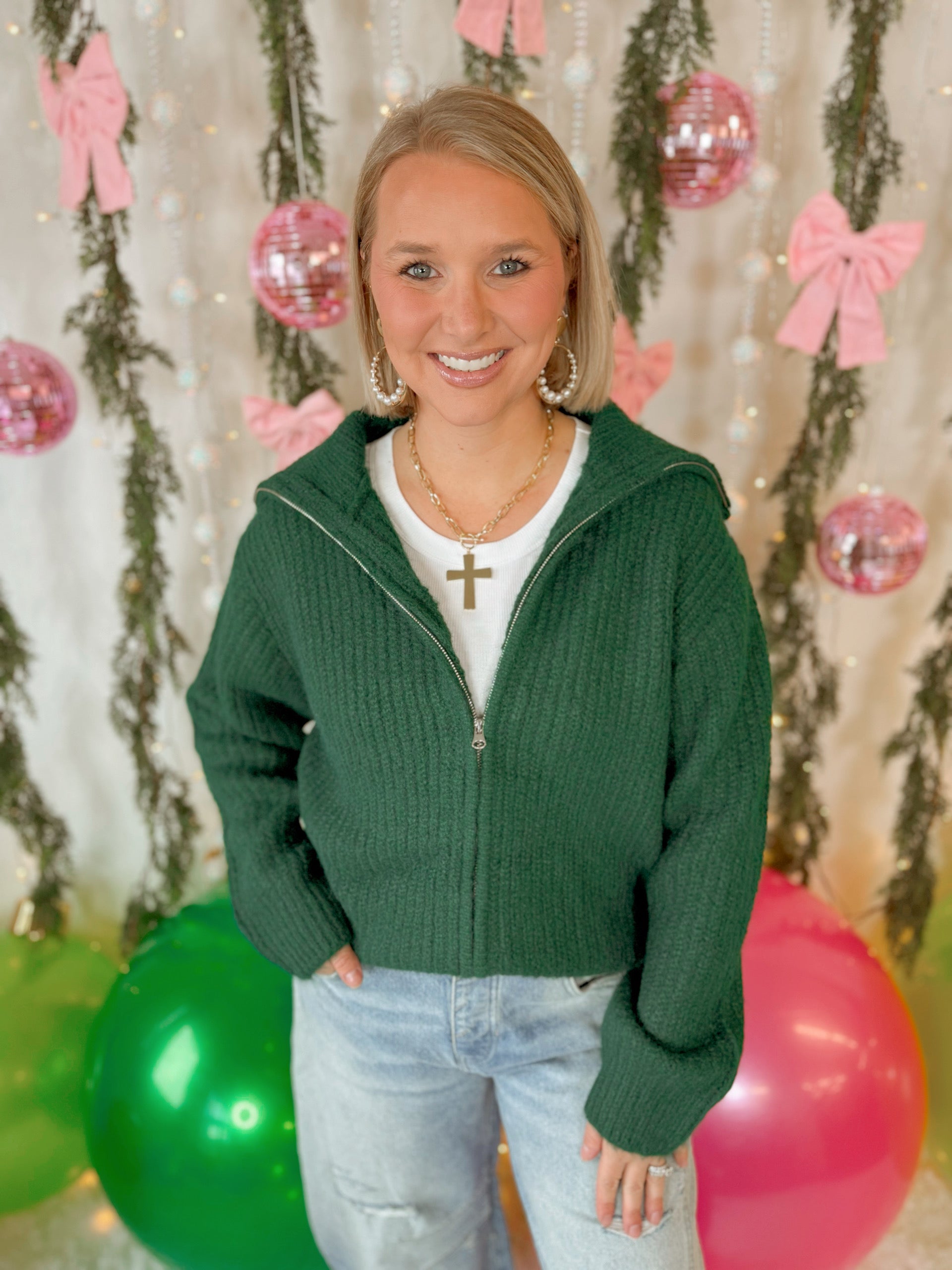Caroline Zip Up Sweater in Hunter Green