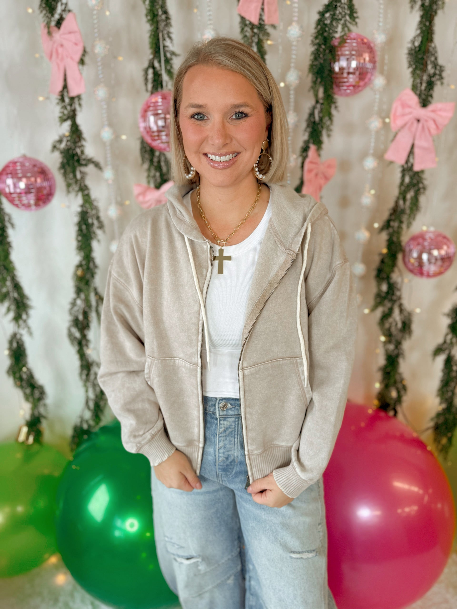 ACID WASH FLEECE CROPPED ZIP-UP HOODIE W POCKETS