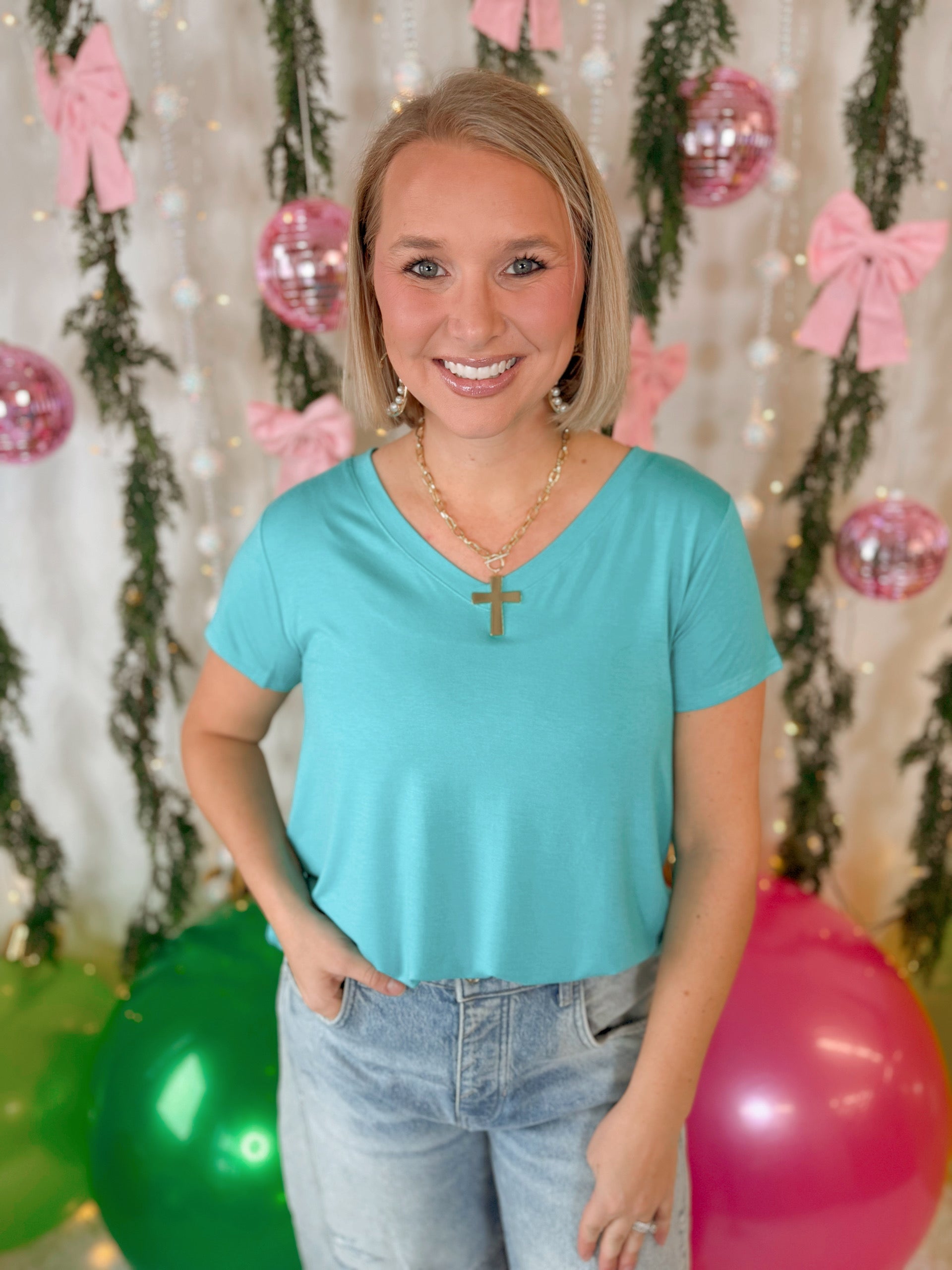 RAYON SHORT SLEEVE V-NECK ROUND HEM TOP
