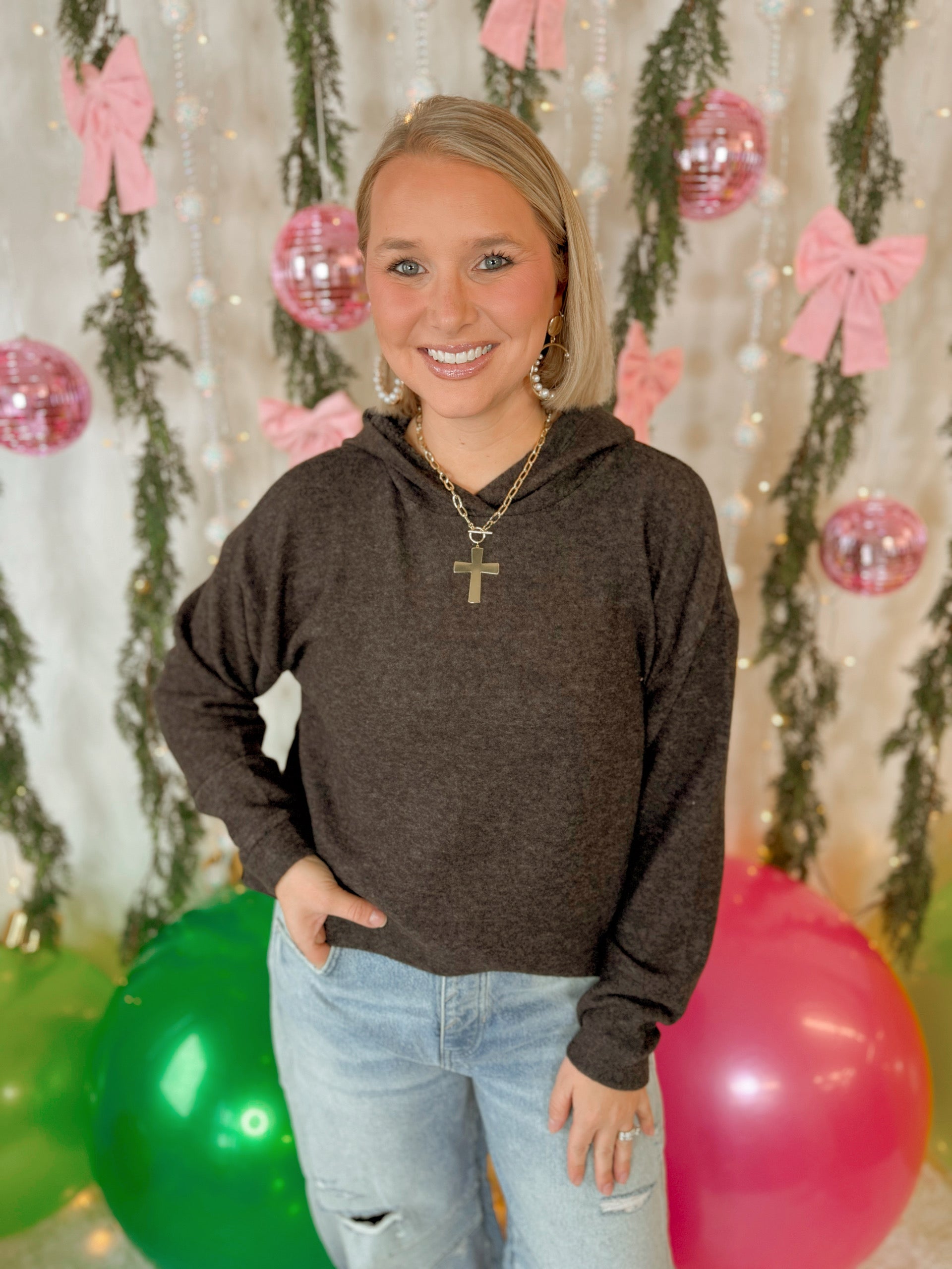 HOODED BRUSHED MELANGE HACCI SWEATER -HI-LOW HEM82%POLYESTER, 15%RAYON, 3%SPANDEX