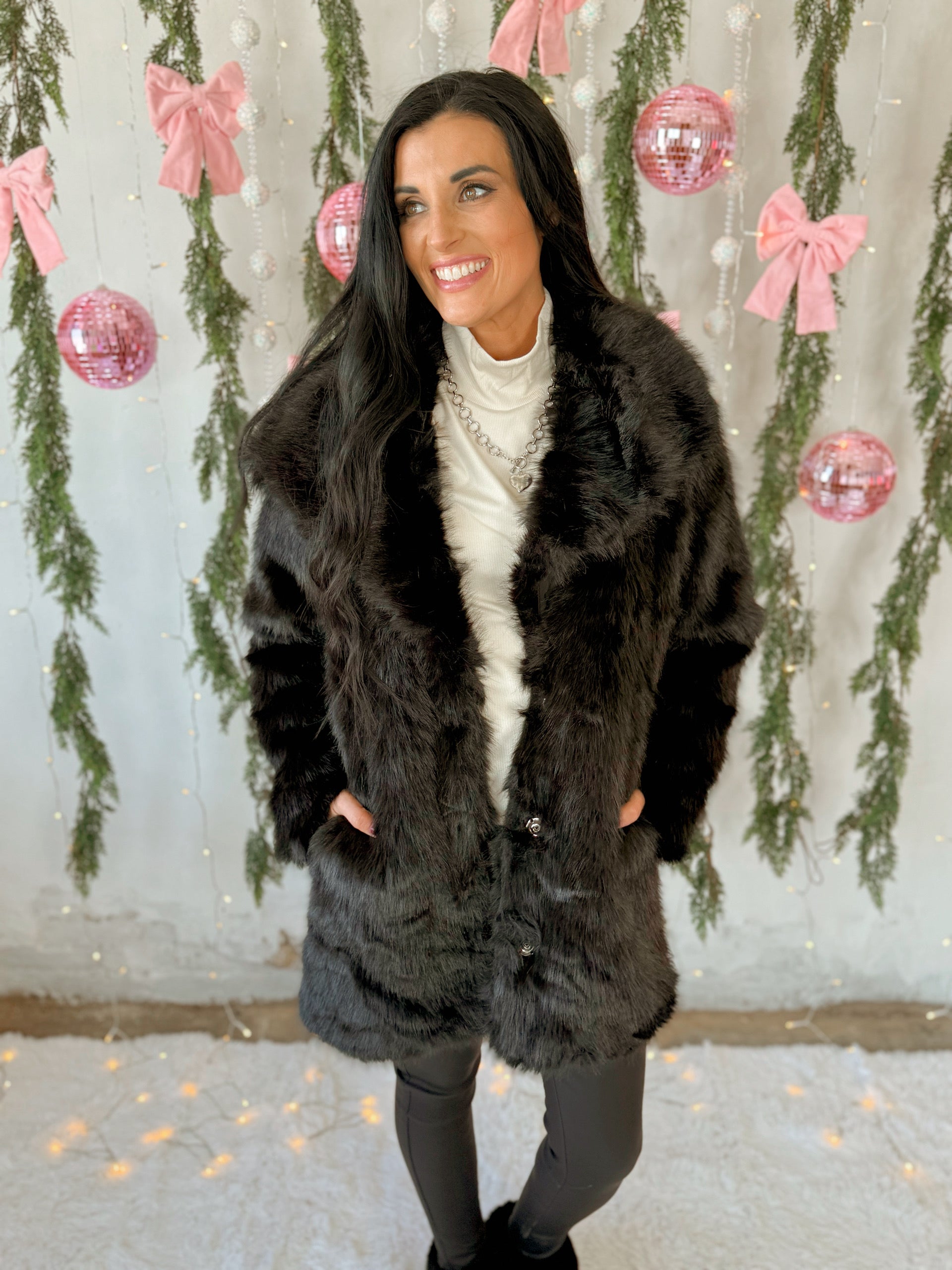 This show-stopping oversized faux fur coat redefines winter elegance with premium plush texture that wraps you in cloud-like softness. The dramatically oversized silhouette creates a cozy, enveloping fit that's both contemporary and timelessly chic.