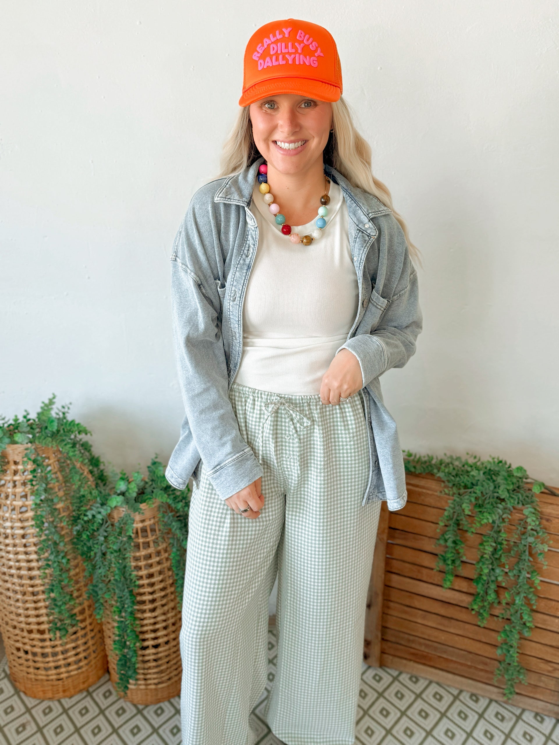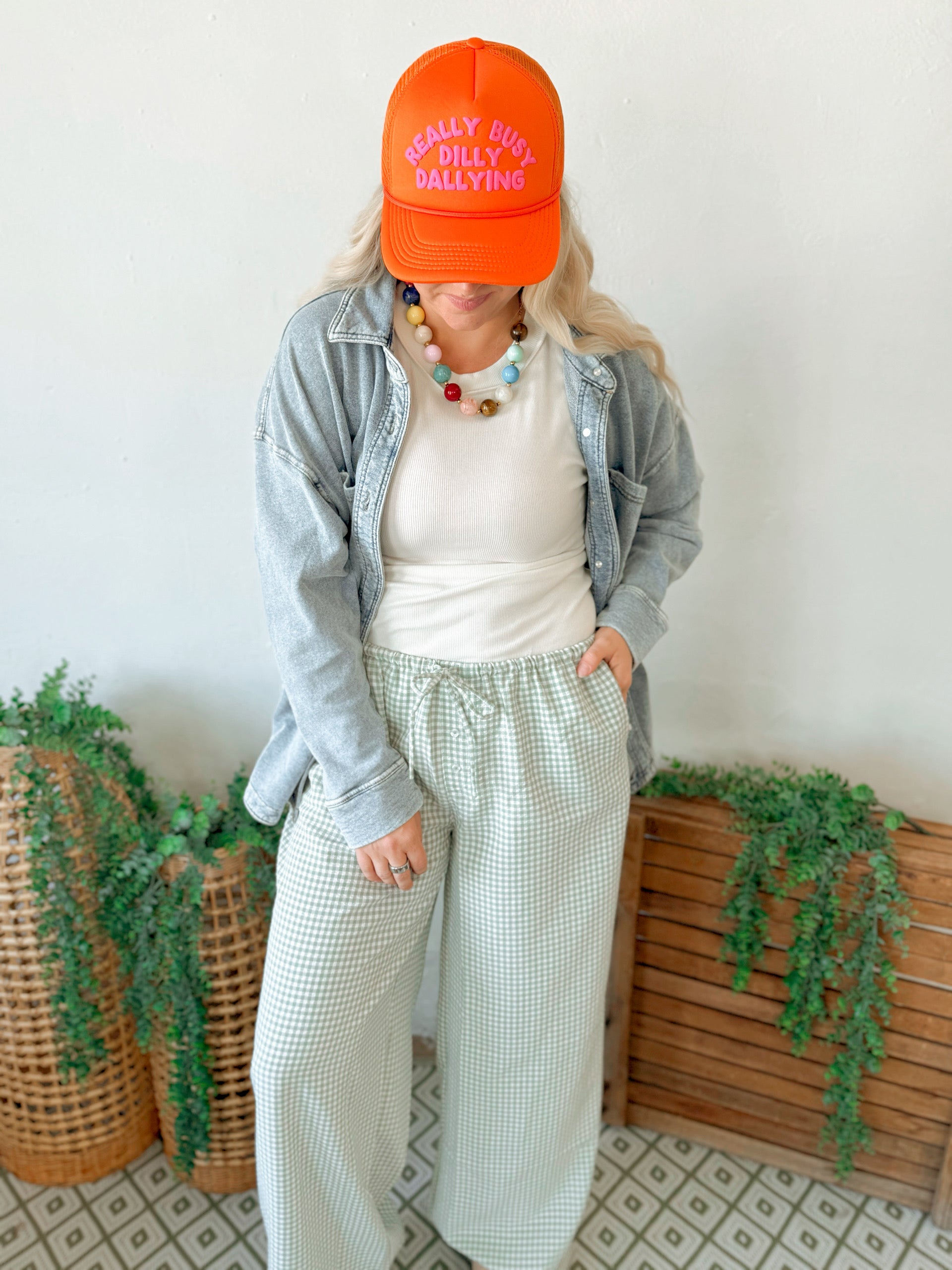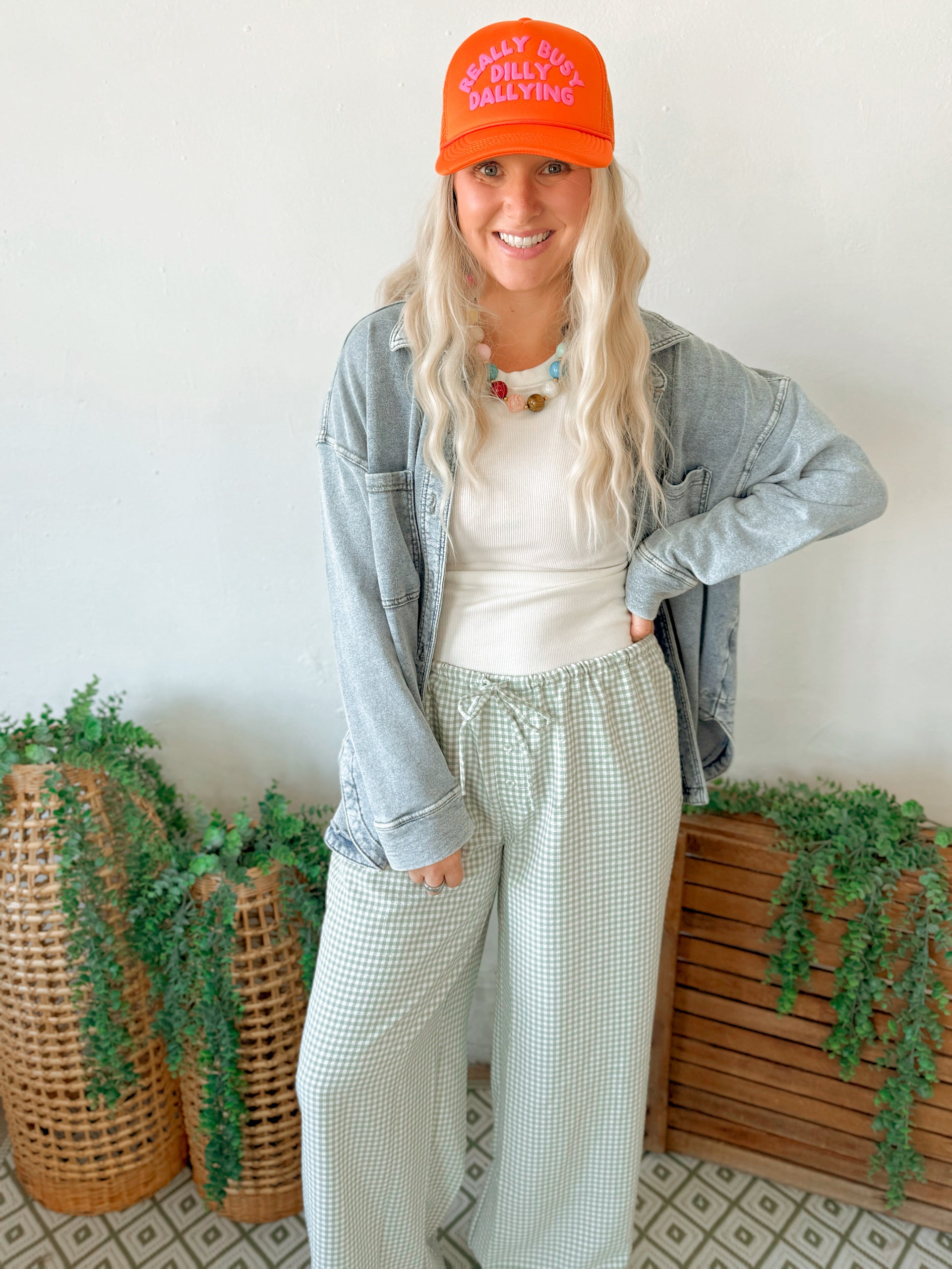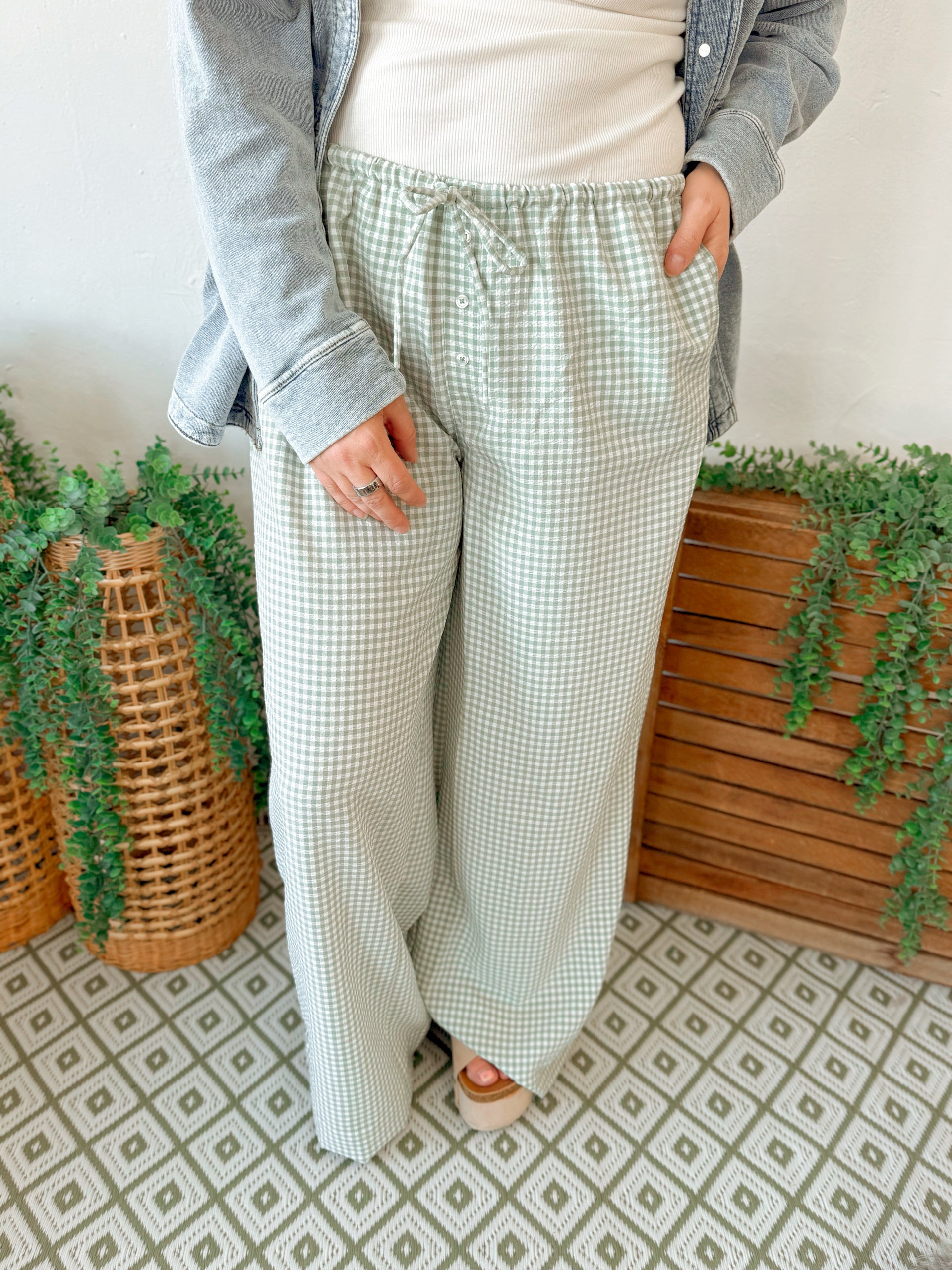 Gingham Drawstring Wide-leg Pants - Sage Green