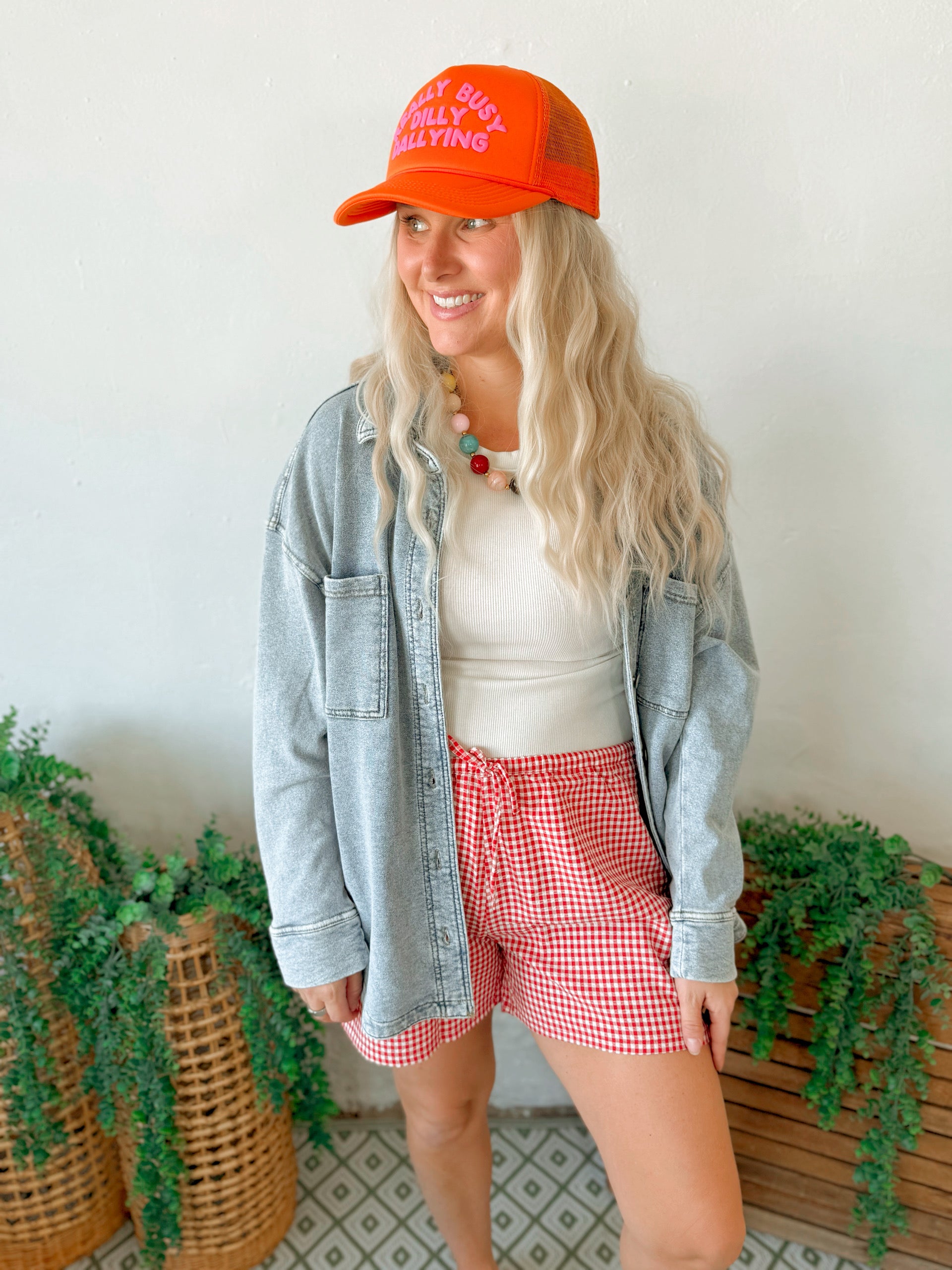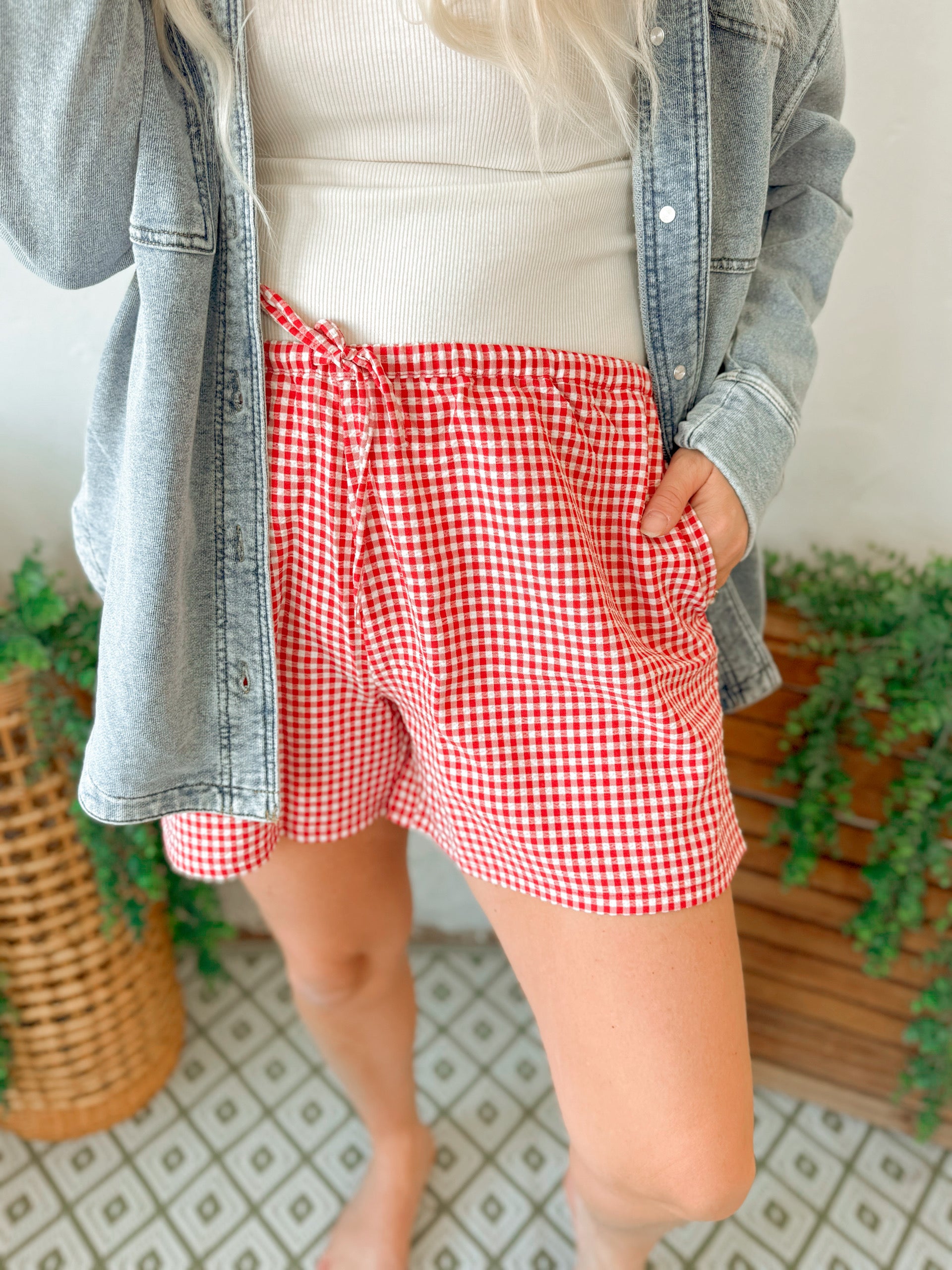 Give your style a cute boost with these shorts. Covered in a gingham pattern, these fun shorts have a drawstring waist that falls into relaxed short legs. Pair them with a basic tank to create a summer ootd. 97% Polyester 3% Spandex