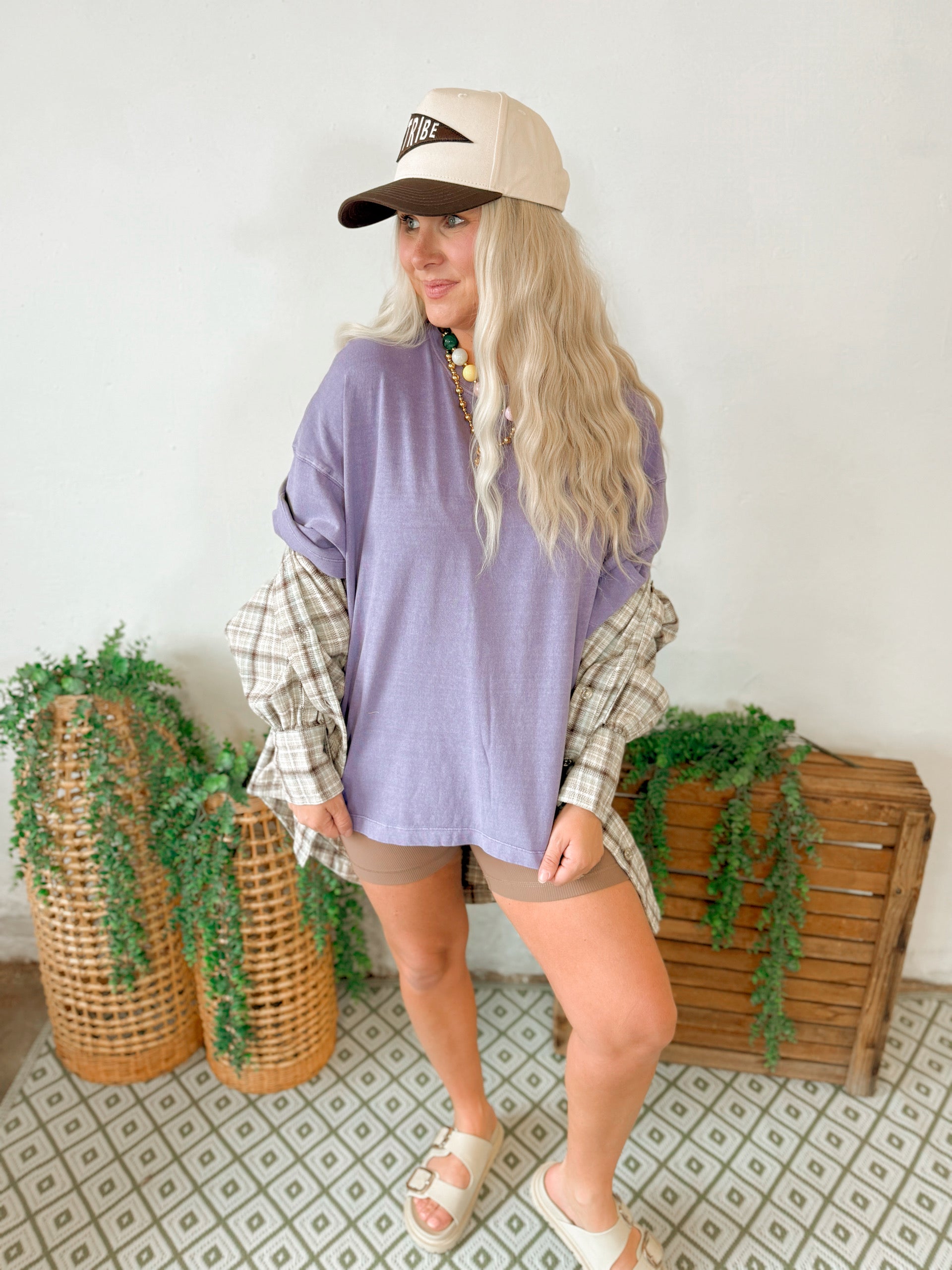This pigment-dyed cotton T-shirt offers vintage-inspired style with a classic crew neckline and dropped shoulders with comfortable, wide sleeves. Cut in an oversized, tunic fit and asn exposed center back seam, this piece can be paired with denim shorts and sneakers for an effortlessly cool, easygoing look.