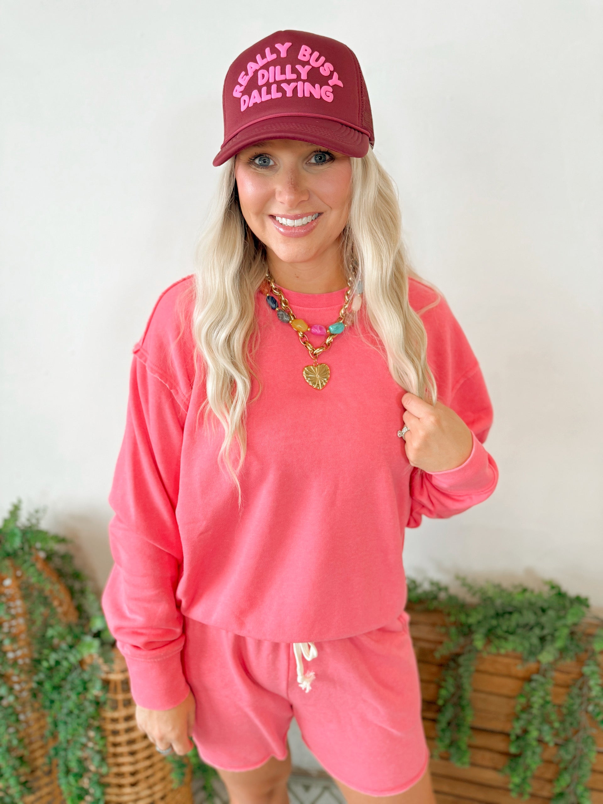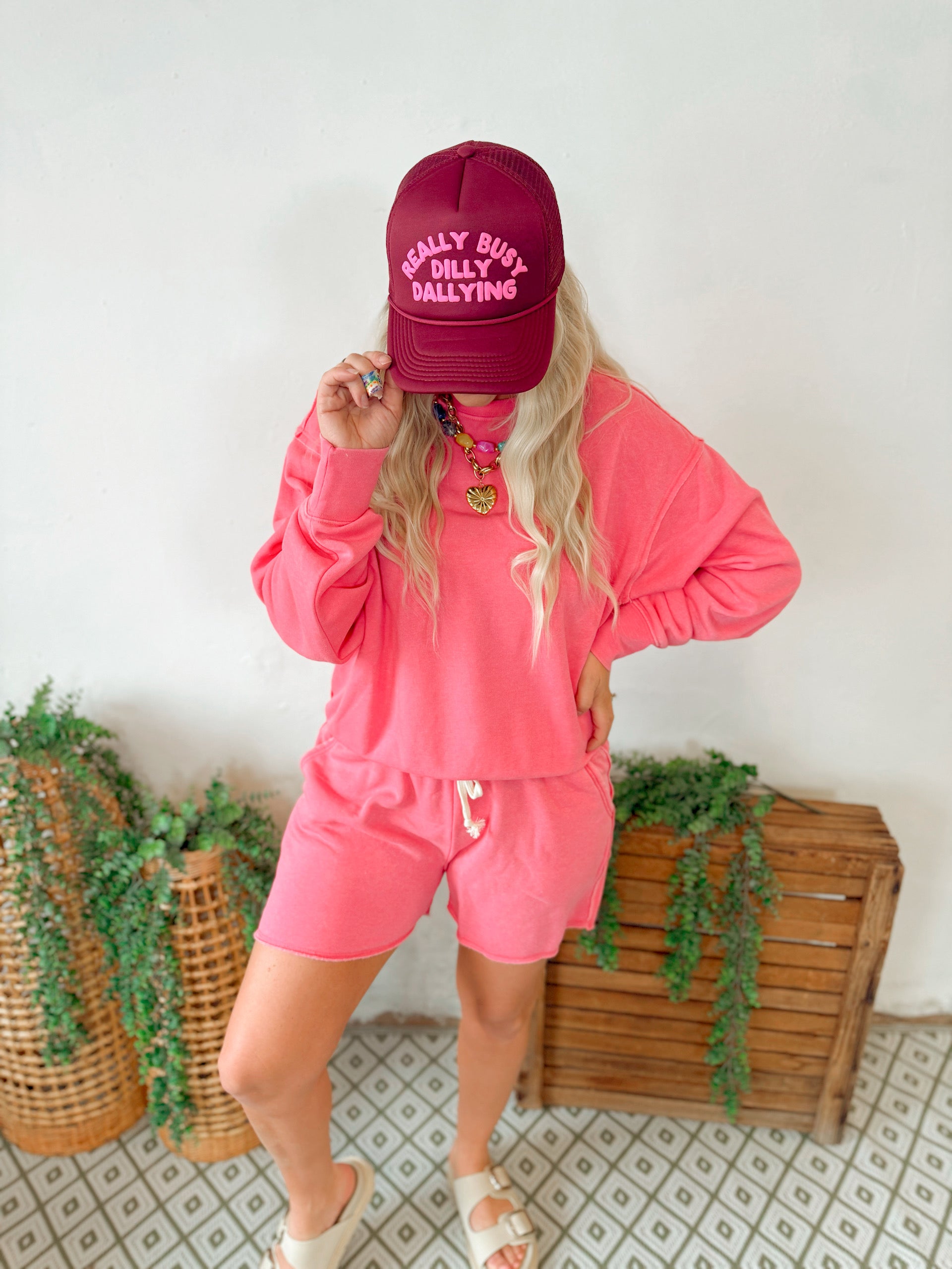 These shorts are crafted from soft burnout french terry and features a comfortable high-rise elastic waistband with a functional drawstring and deep side seam pockets. The cut is a relaxed, mid-thigh fit with exposed seams and a raw-edge hemline.