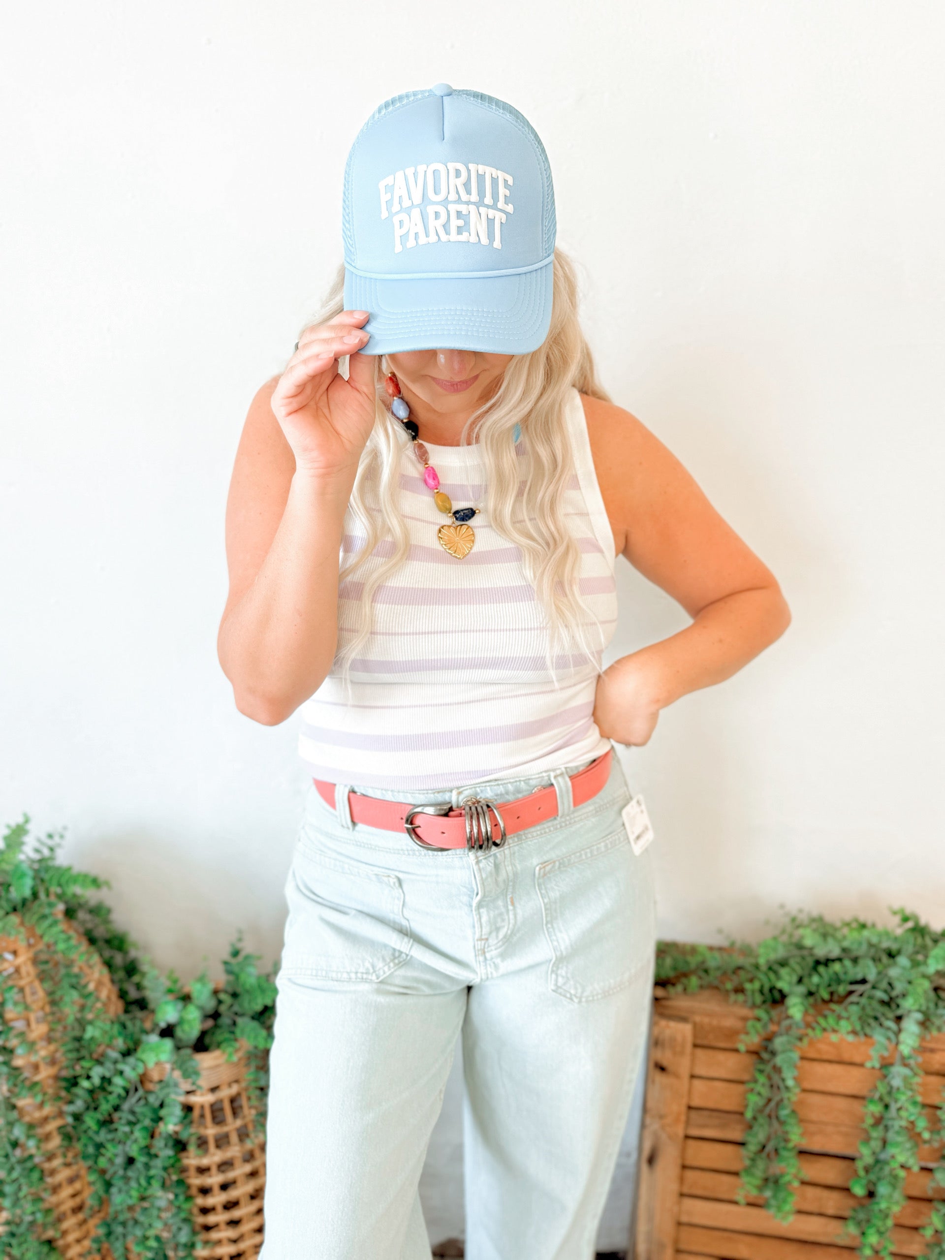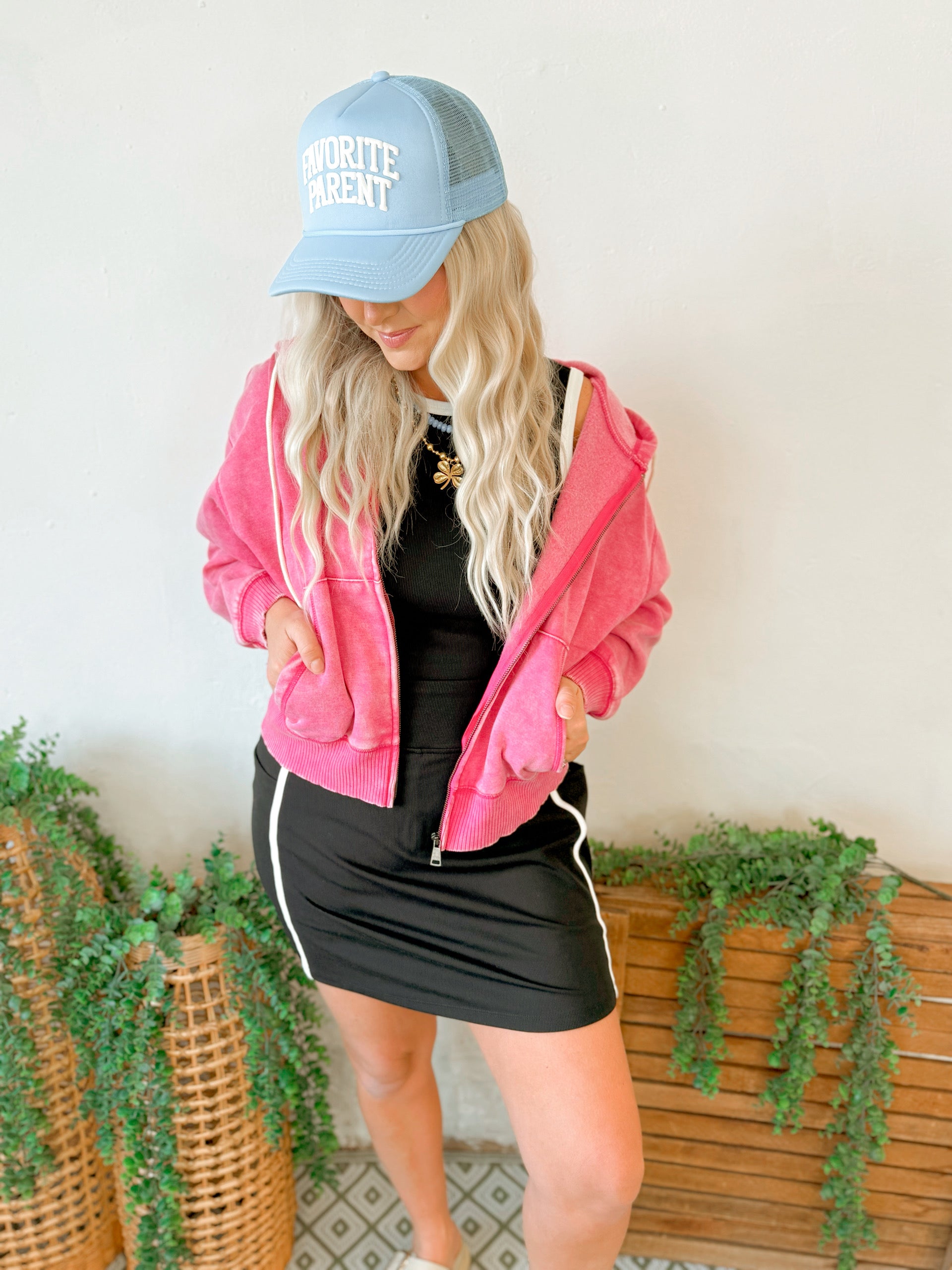 Adjustable trucker hat with puff writing.