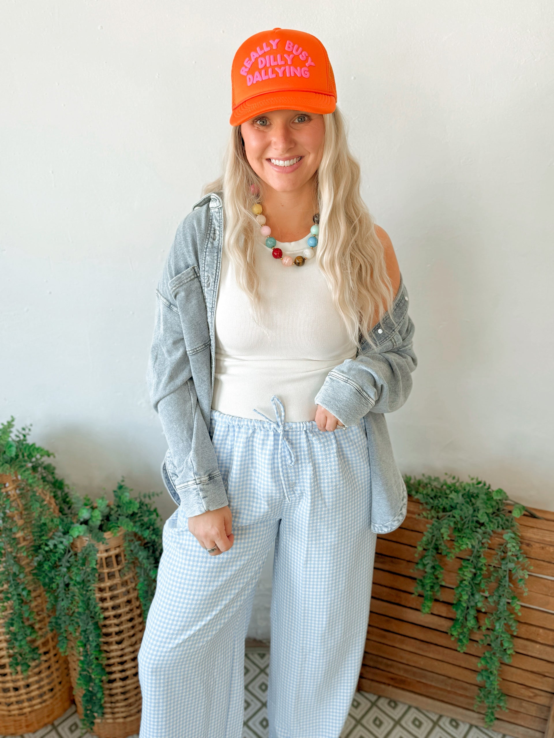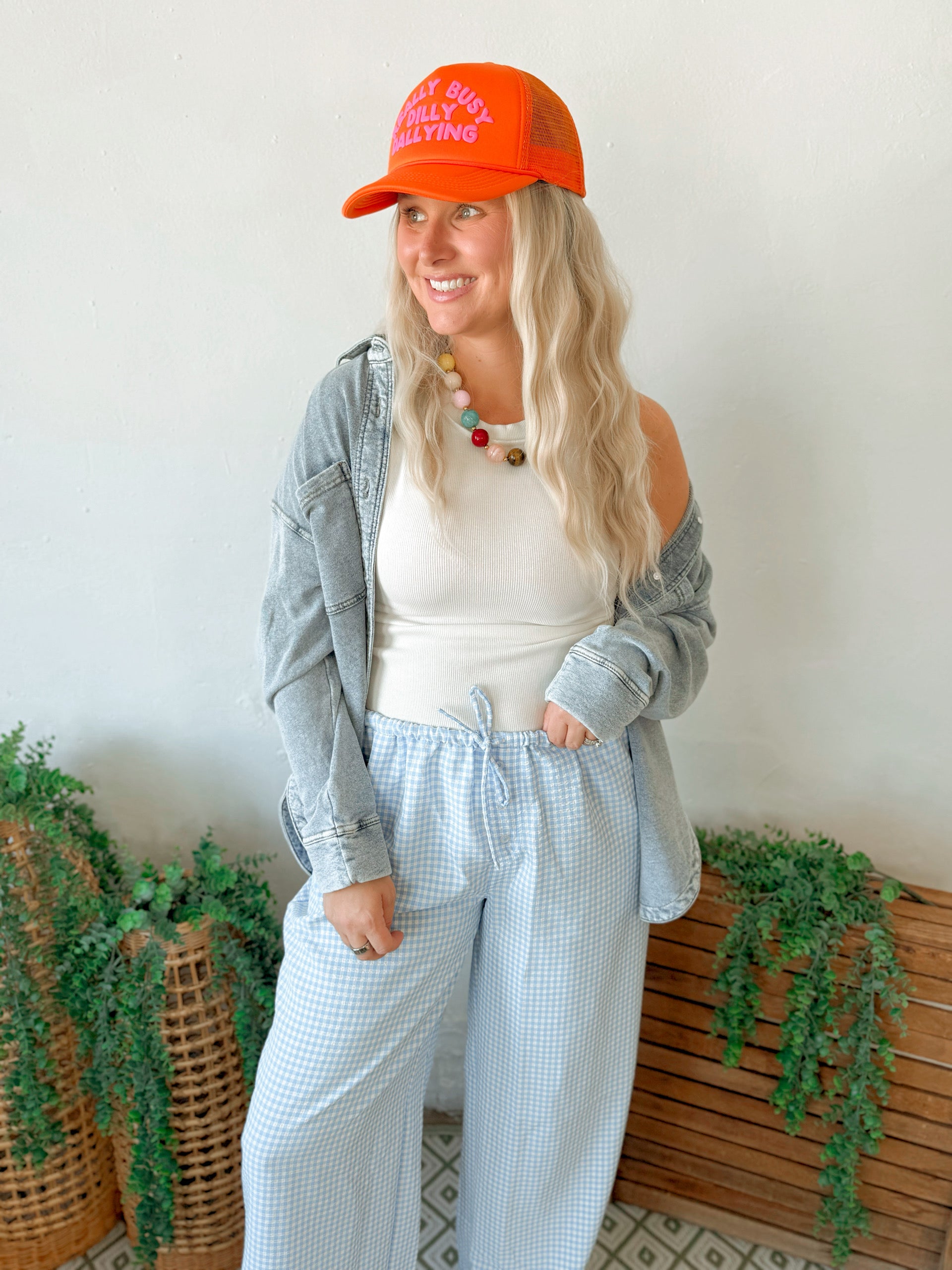 Embrace pattern with these woven gingham trousers, defined by a breezy, wide-leg silhouette. They feature a flexible elasticized waistband secured by a drawstring tie and hidden side pockets. A unique decorative button-fly placket adds visual flair. Style with a tucked-in tee and ankle boots for a chic, relaxed aesthetic.