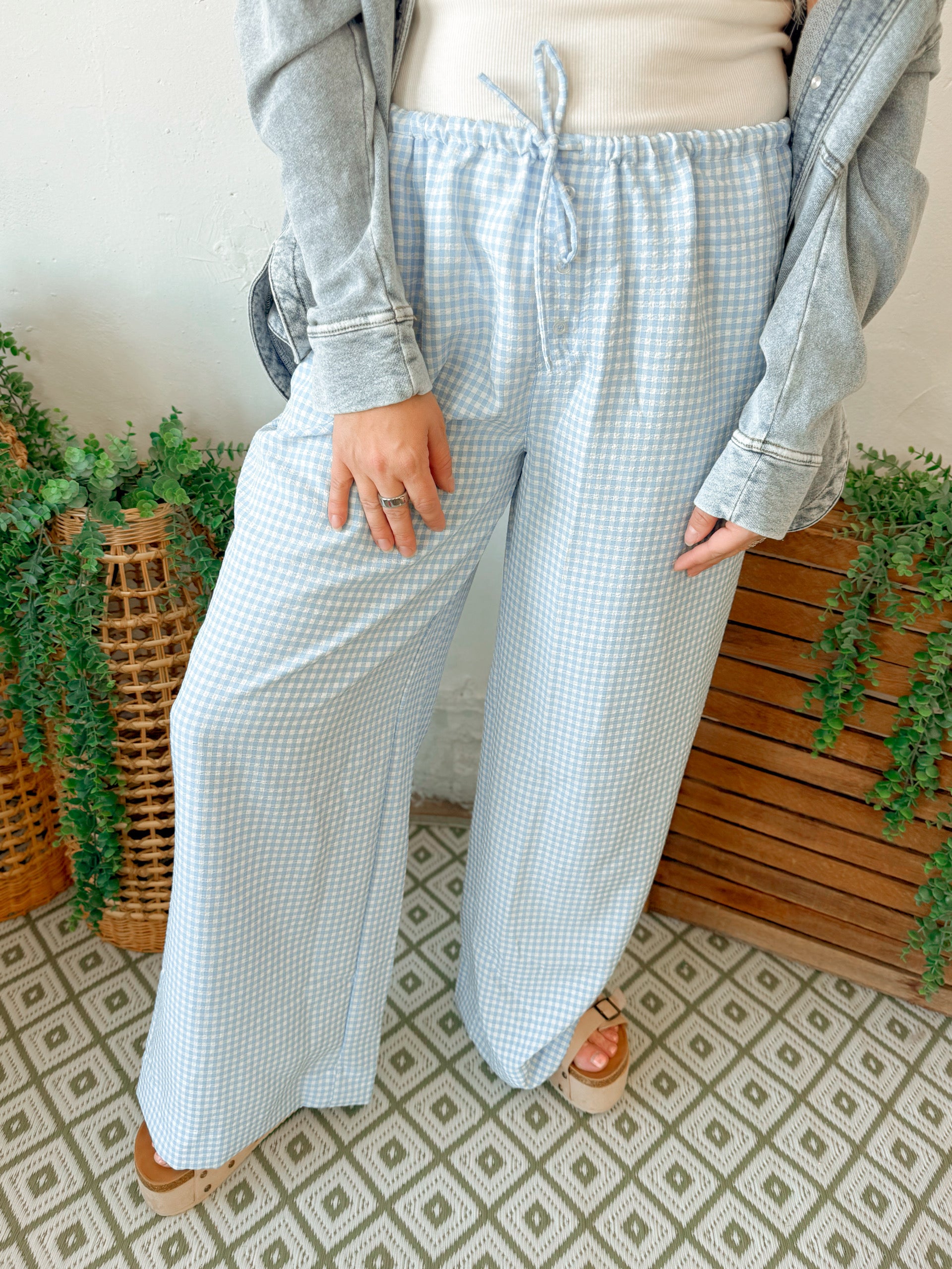 Gingham Drawstring Wide-leg Pants - Blue