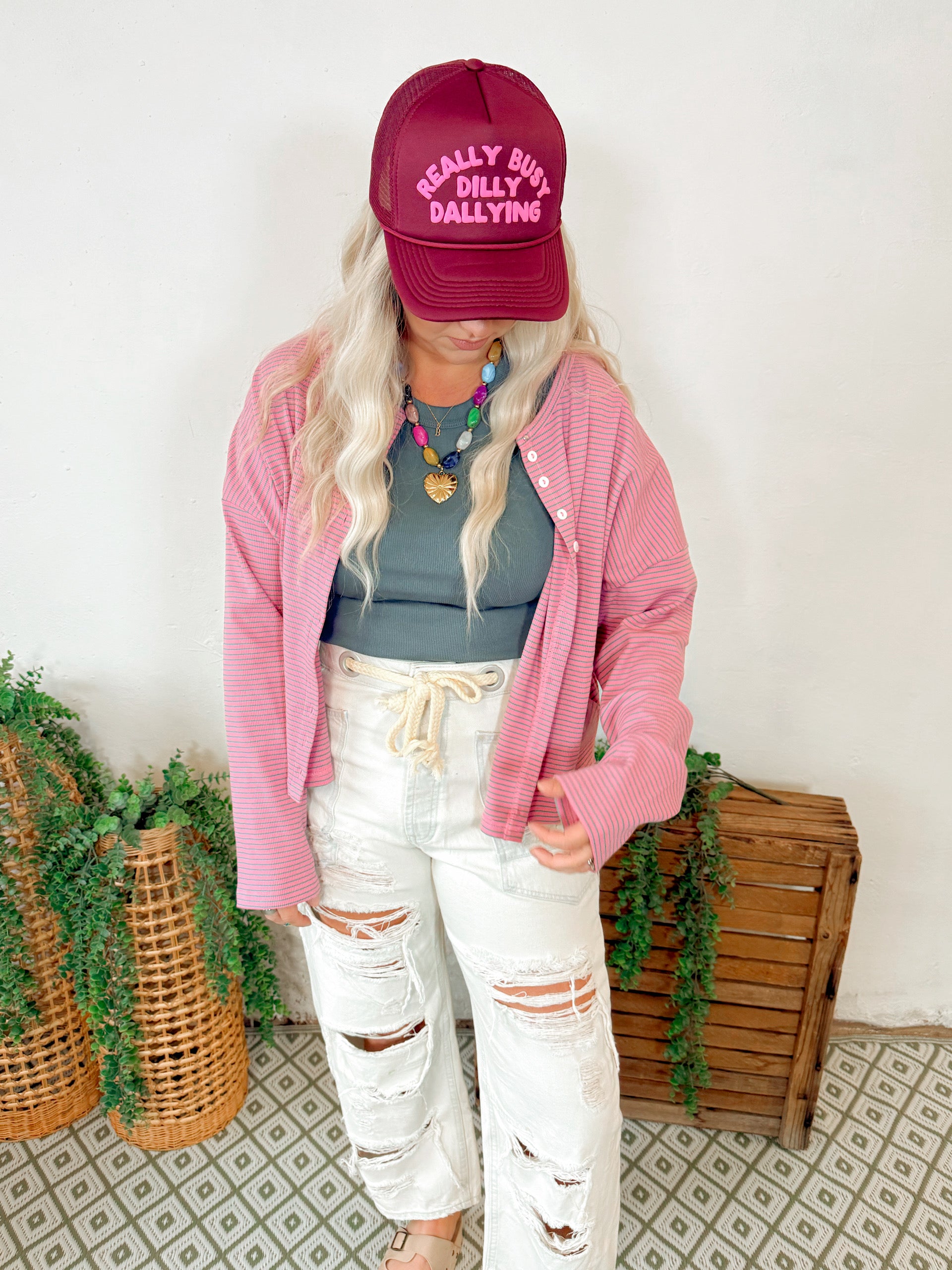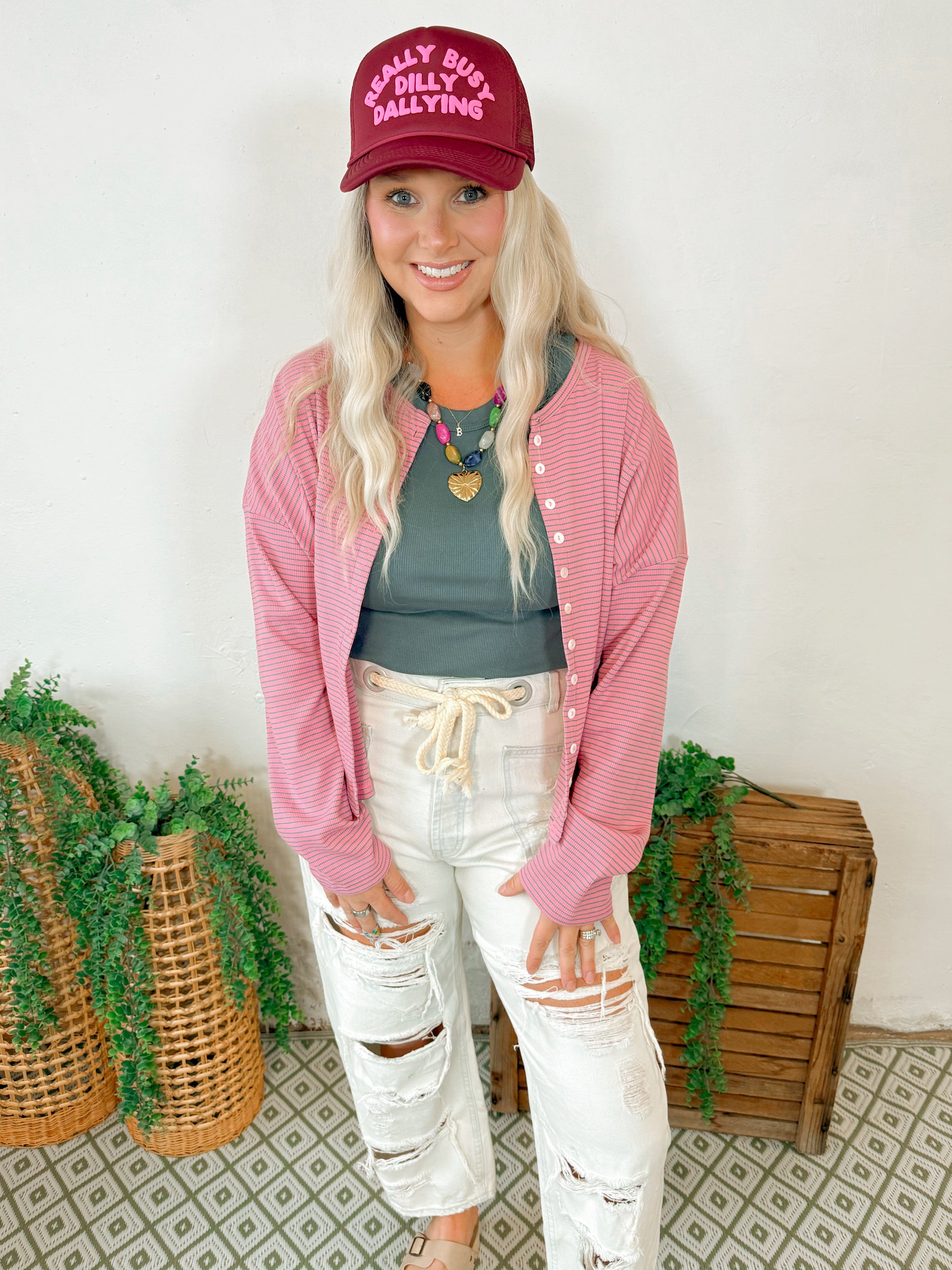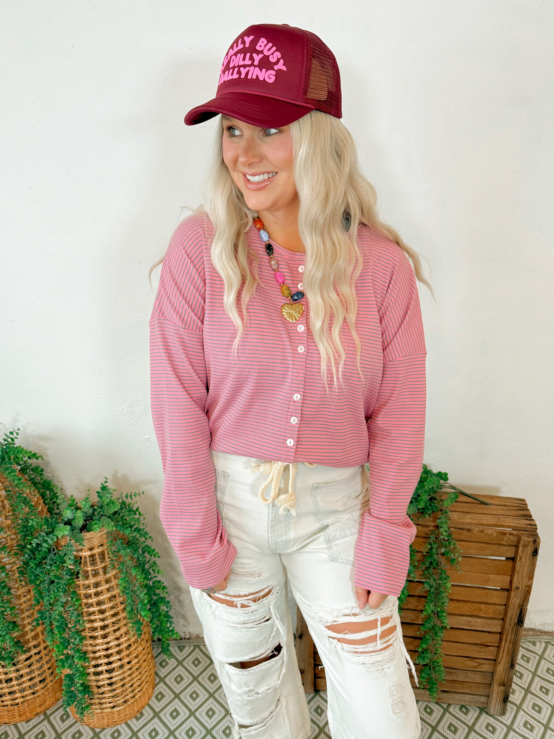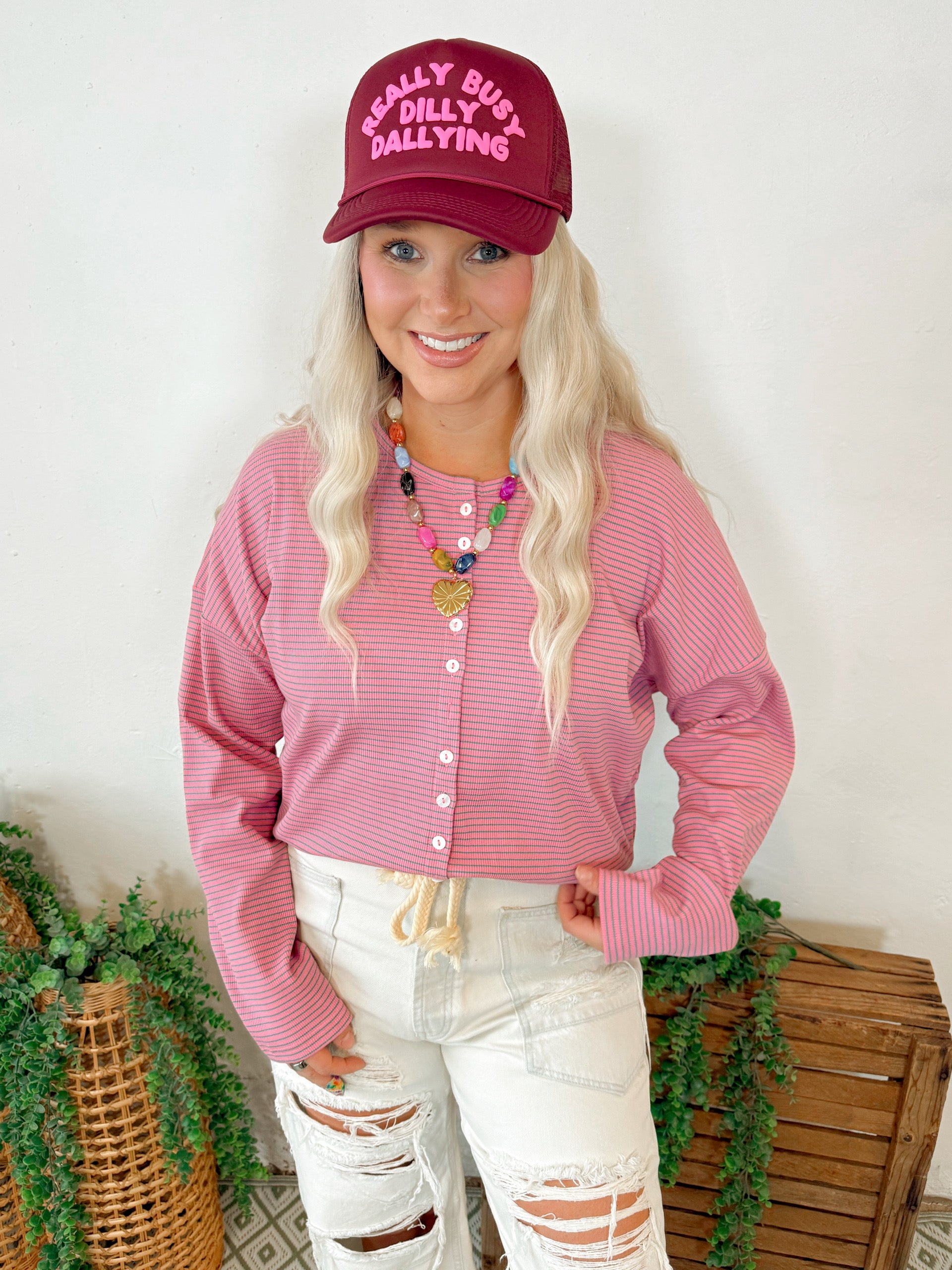 Mia Ribbed Button Down Cardigan in Pink Stripe